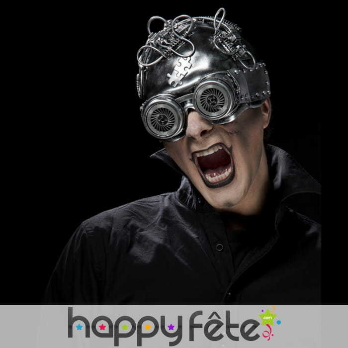 Ce casque avec lunettes futuriste, pour homme ou femme, est l'accessoire idéal pour se mettre dans la peau d'un geek. Nous avons ici un casque en PVC noir pourvu de divers branchements argentés. Des lunettes, dont les verres représentent des illusions d'optique en imitation métal, y sont intégrées. Ce casque suffit à lui seul pour parfaire un déguisement d'Alien, avec une petite touche de maquillage.
