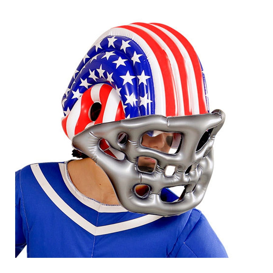 Vous aimez les sports d'équipe ? Optez pour ce casque de footballeur américain gonflable, convenant aux hommes et aux petits garçons. A l'effigie du drapeau américain, le haut est fait de rayures rouges et blanches, et d'étoiles bleues et blanches. Le devant, censé protéger le visage, est en gris. Cet accessoire est très pratique du fait qu'il soit gonflable, et est également léger à porter.