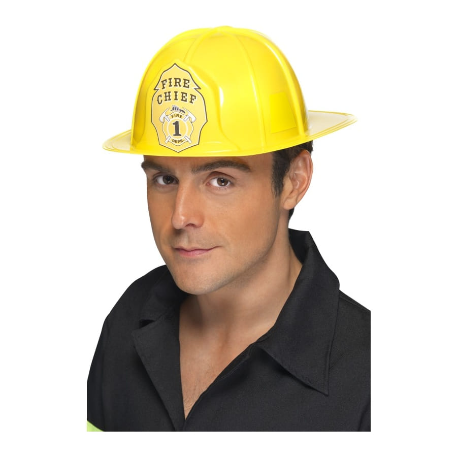 Casque de pompier en plastique de couleur jaune, pour homme. Cet accessoire est orné d'un logo 'Fire Chief 1' assorti. Il sera idéal pour compléter votre déguisement de pompier à l'occasion d'une soirée déguisée.