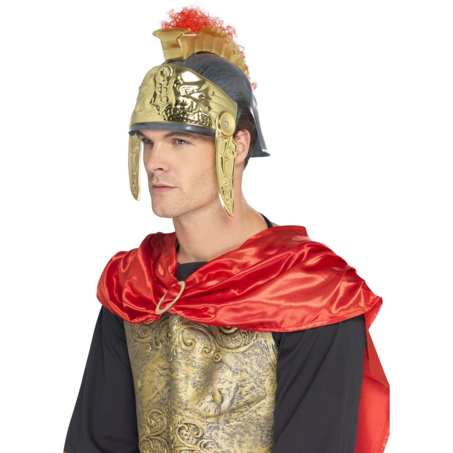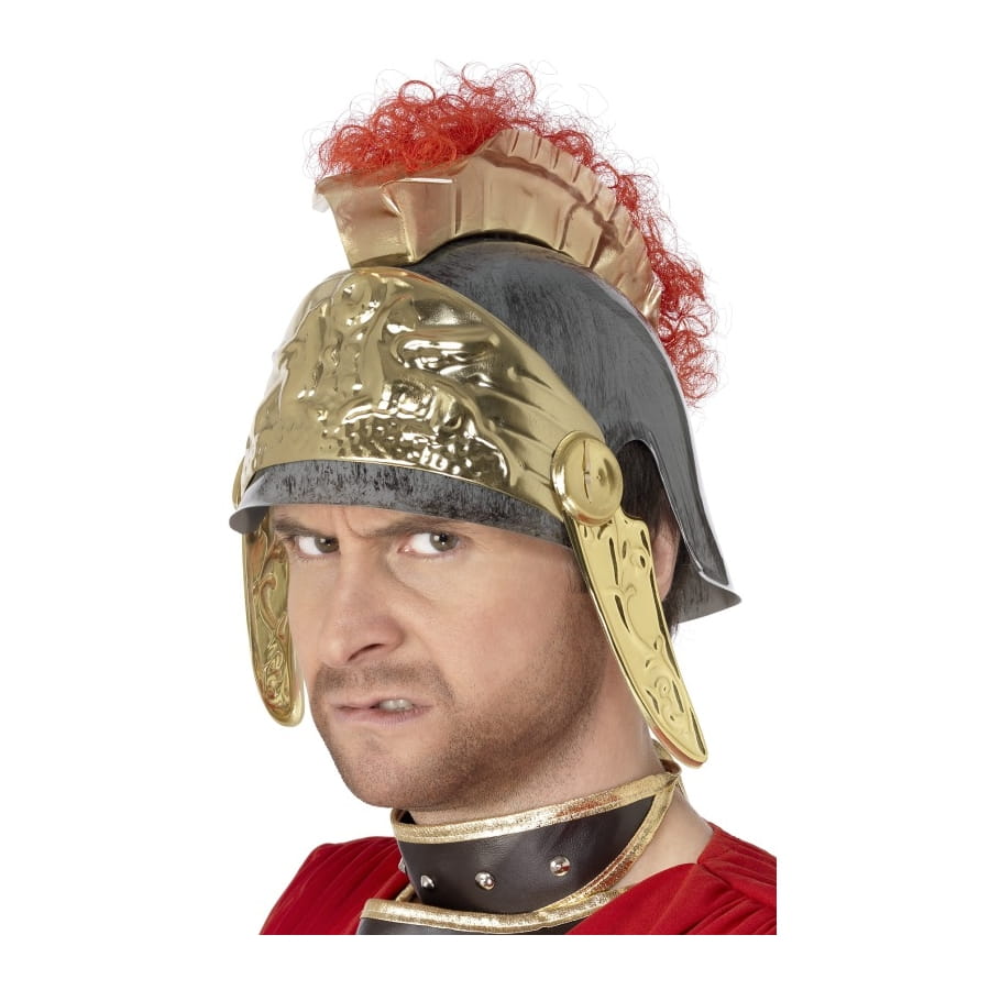 Casque de soldat romain, pour homme ou adolescent, de couleur noire et dorée avec brosse rouge et dorée. Incarnez un fidèle guerrier de César en enfilant ce casque pour une fête déguisée!