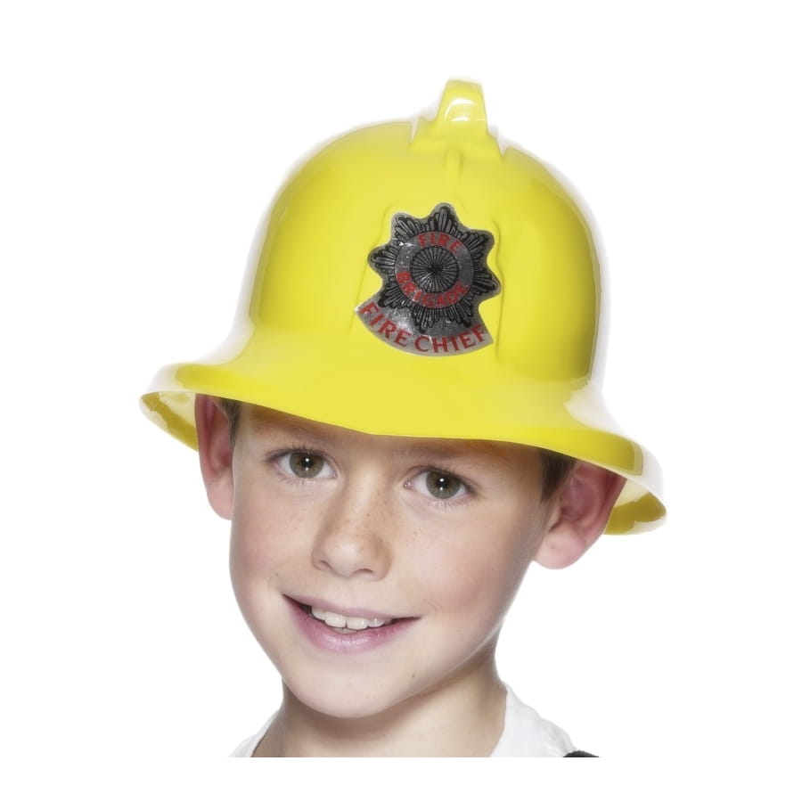 Casque de pompier de couleur jaune, avec logo de couleur dorée, noire et rouge, pour garçon. Ce casque fera plaisir à votre enfant, particulièrement s'il aime les pompiers!