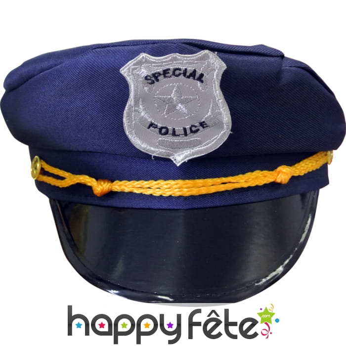 Soyez respecté et admiré avec un déguisement de policier. Vous allez faire respecter la loi et la justice lors d'une soirée costumée avec un bel uniforme d'officier. Complétez votre panoplie avec cette superbe casquette de policier américain. Elle est de couleur bleue, or et bronze avec un galon doré autour, et une insigne de police sur le devant. Incarnez un bel officier de l'ordre américain, tout comme au cinéma, et vos amis seront bien surpris de vous voir !