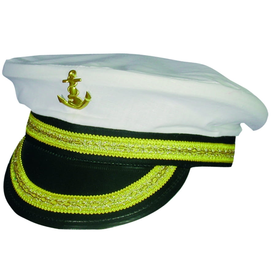 Casquette d'amiral blanche ornée de décorations dorées. C'est un accessoire parfait pour compléter un déguisement de capitaine ou de marin pour un carnaval.