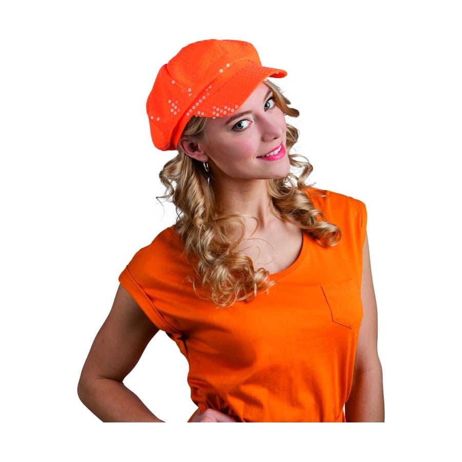 Avec sa couleur orange fluo et sa surface entièrement décorée de sequins scintillants, cette casquette conviendra parfaitement à une soirée rétro entre amis.