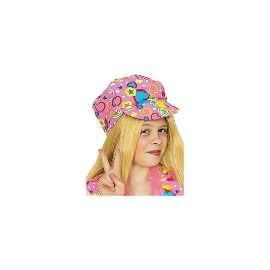Une casquette style hippie pour petite fille. De couleur rose avec des cœurs, des étoiles et des fleurs dessus, elle pourra le porter pour compléter son déguisement de hippie pour le carnaval ou une fête sur les années 50.