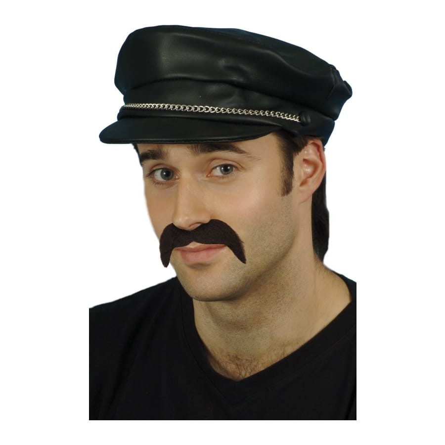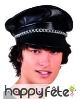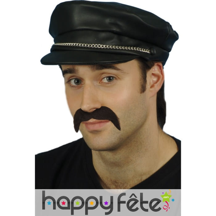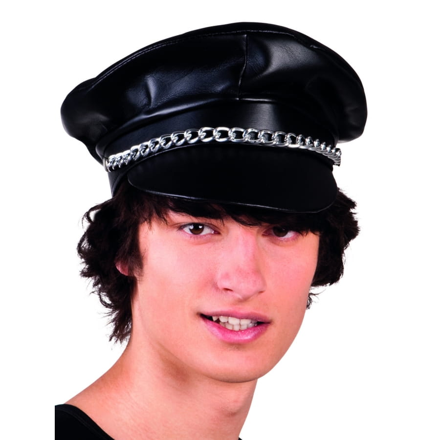 Casquette Village People, pour homme ou adolescent, entièrement en cuir de couleur noire ornée d'une chaînette argentée. Cet accessoire est parfaitement adapté à une tenue d'enterrement de vie de garçon ou de jeune fille ou pour un déguisement pour la fête de la musique.