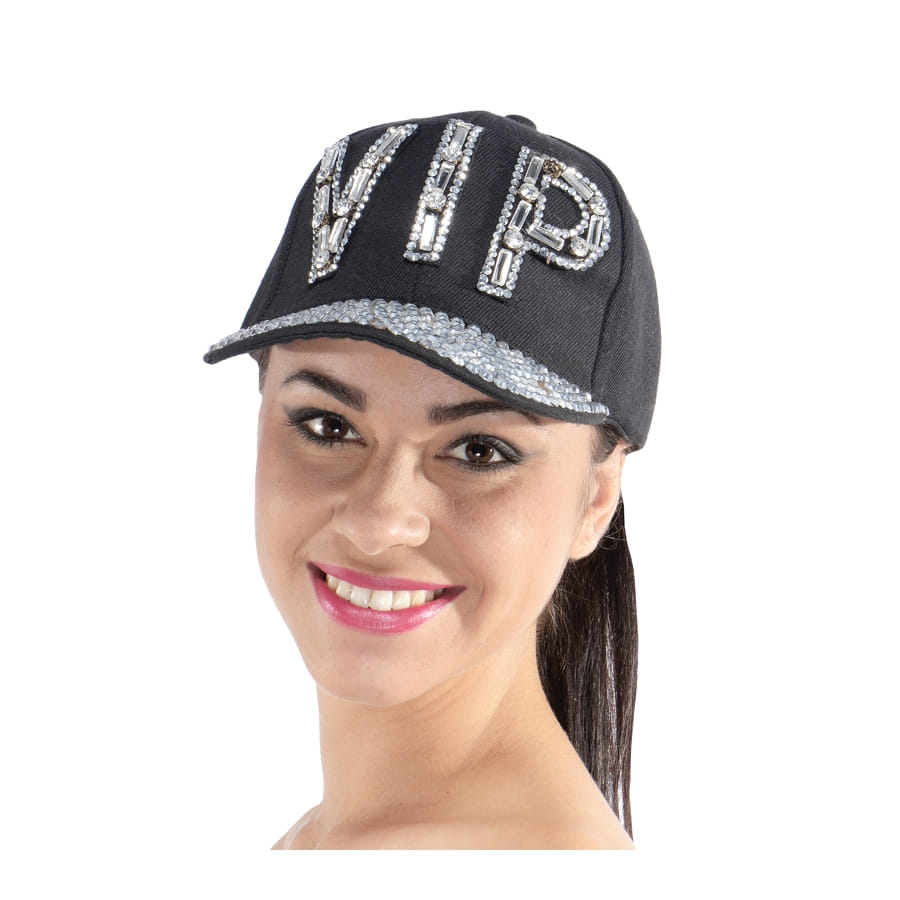 Lorsque vous vous déguisez en VIP, dès que l'on vous voit, on devrait reconnaître votre personnage. Cette casquette vip avec brillants vous aidera pour cela. Sur cette casquette noire, il y a l'inscription VIP faite avec des pierres qui luisent de mille feux. Cette casquette, très bien faite, est pour les hommes et les femmes.