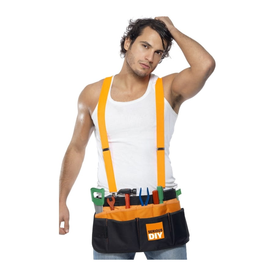 Ceinture de couleur orange et noire avec outils en plastique, pour homme. Parmi les outils, vous retrouverez marteau, scie, clé, pince et tournevis. C'est l'accessoire parfait pour se déguiser en ouvrier ou en homme à tout faire.