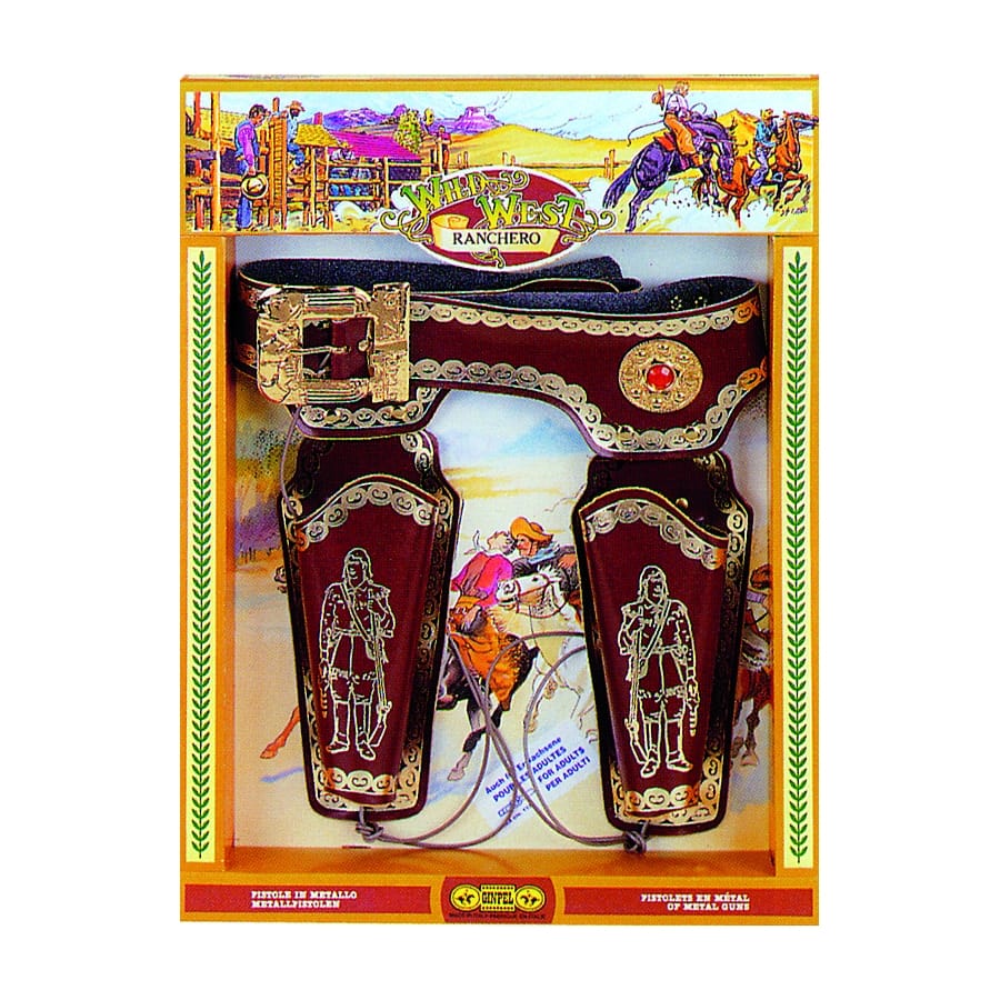 Ceinturon or, bronze et marron à double holster. Cet accessoire de luxe mesure 115 centimètres de long. Il est vendu vide. C'est un accessoire idéal pour faire de vous un vrai cowboy!