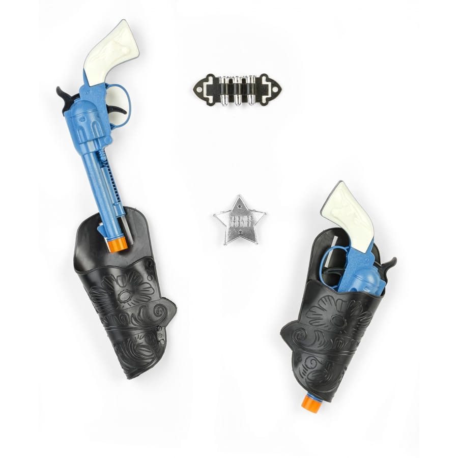 Set de déguisement pour enfant composé d'un ceinturon noir, de deux pistolets argentés et bleus et d'une étoile argentée. Avec cet ensemble d'accessoires, votre enfant pourra s'amuser à jouer au shérif et au cowboy avec ses camarades.