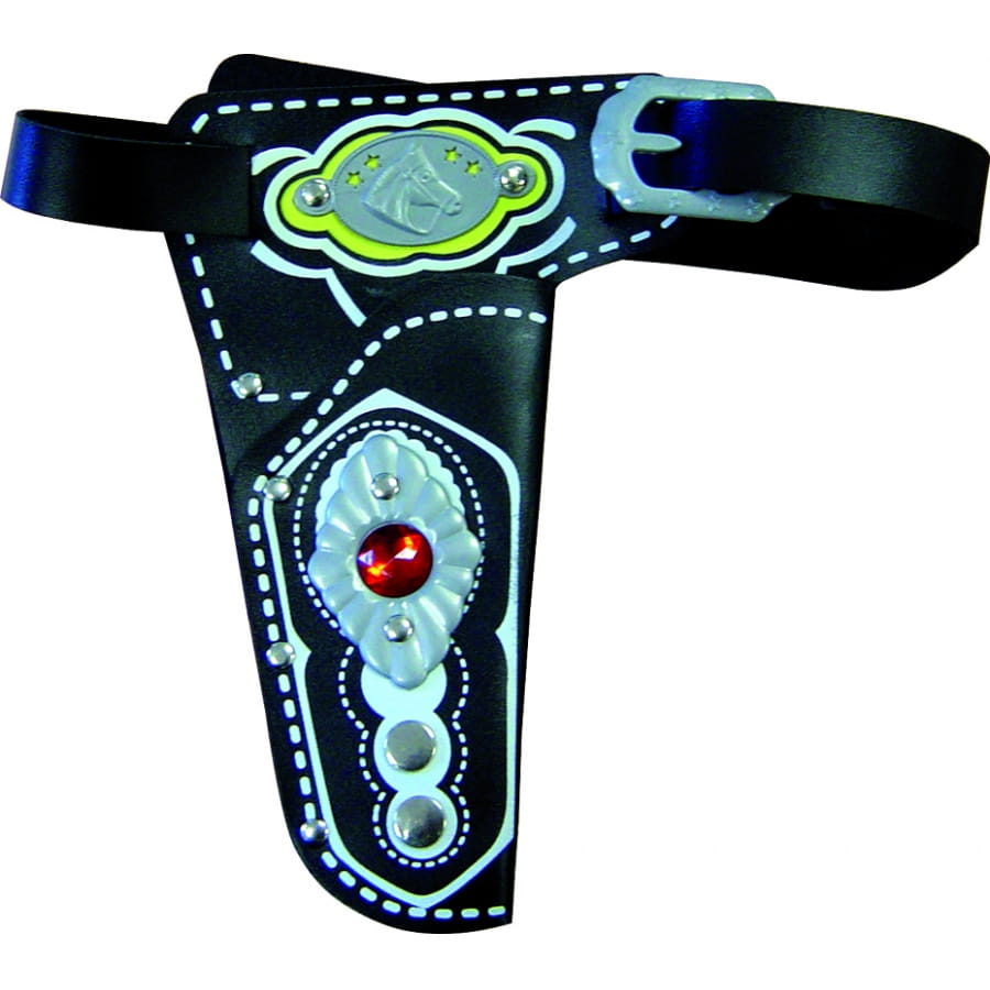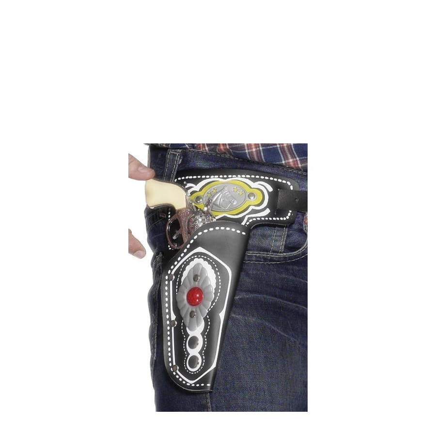 Ceinturon à holster simple de couleur noire orné de motifs argentés et jaunes surmonté d'une pierre rouge. Cet accessoire vous sera livré vide. Il est idéal pour compléter avec classe une tenue de cowboy pour un carnaval.