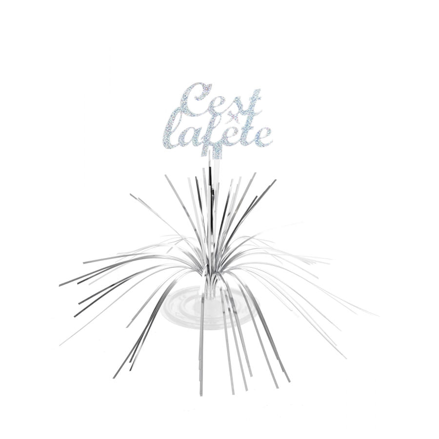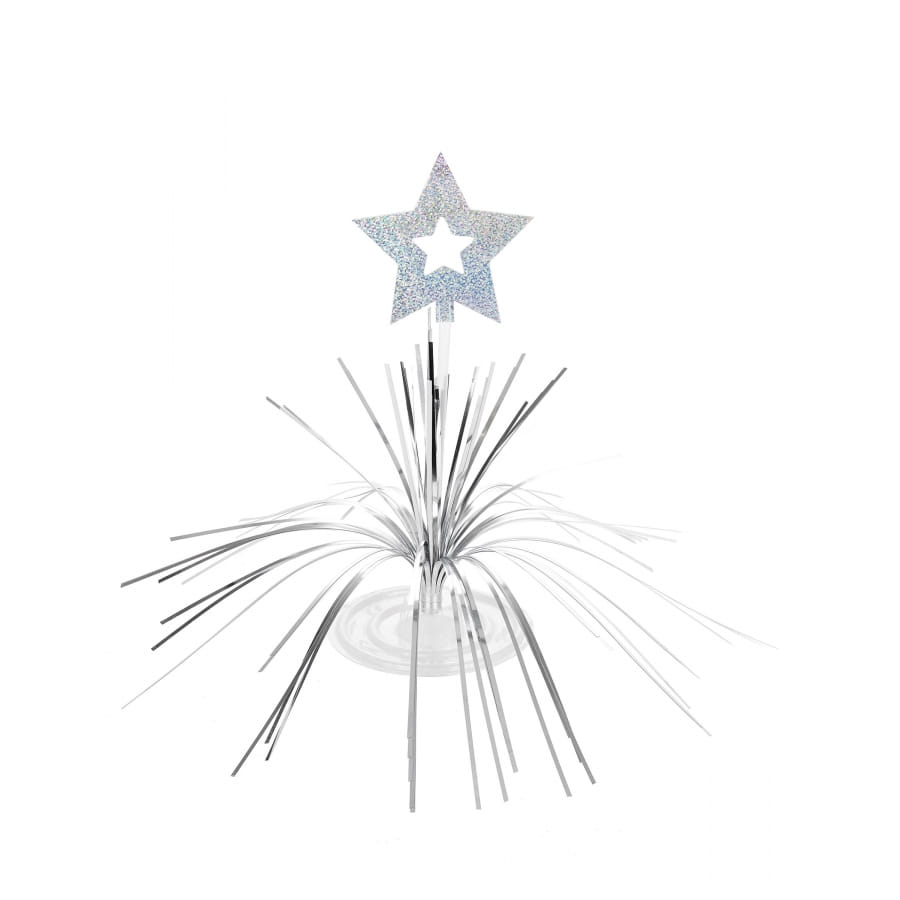 La décoration est faite de fils de couleur argent disposés en cascade et surmontant un socle en plastique.