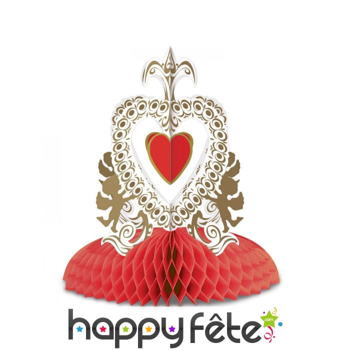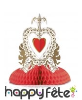 Fait en papier alvéolé rouge de 30 cm de diamètre, il est surmonté d'un gros coeur doré au centre duquel est fixé un petit coeur rouge.