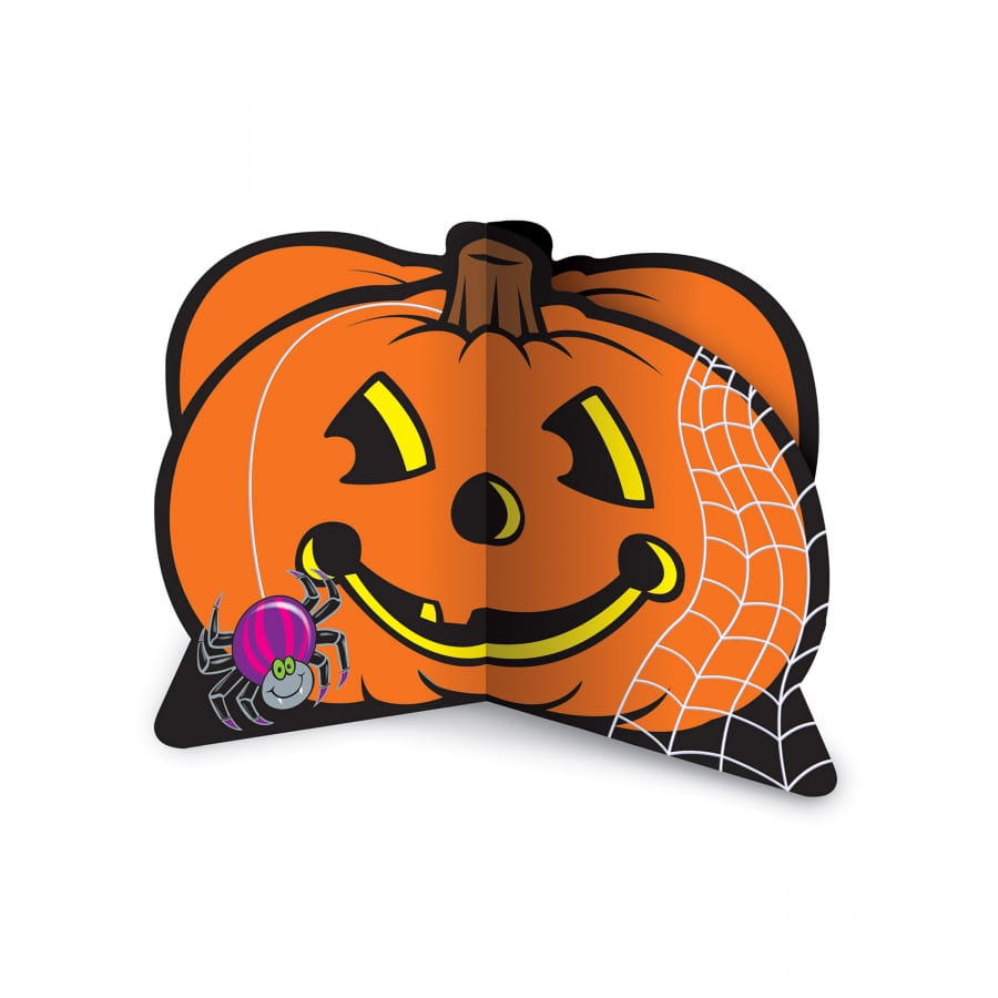 Ce centre de table en carton met en évidence une belle citrouille orange sur laquelle une araignée tisse sa toile.