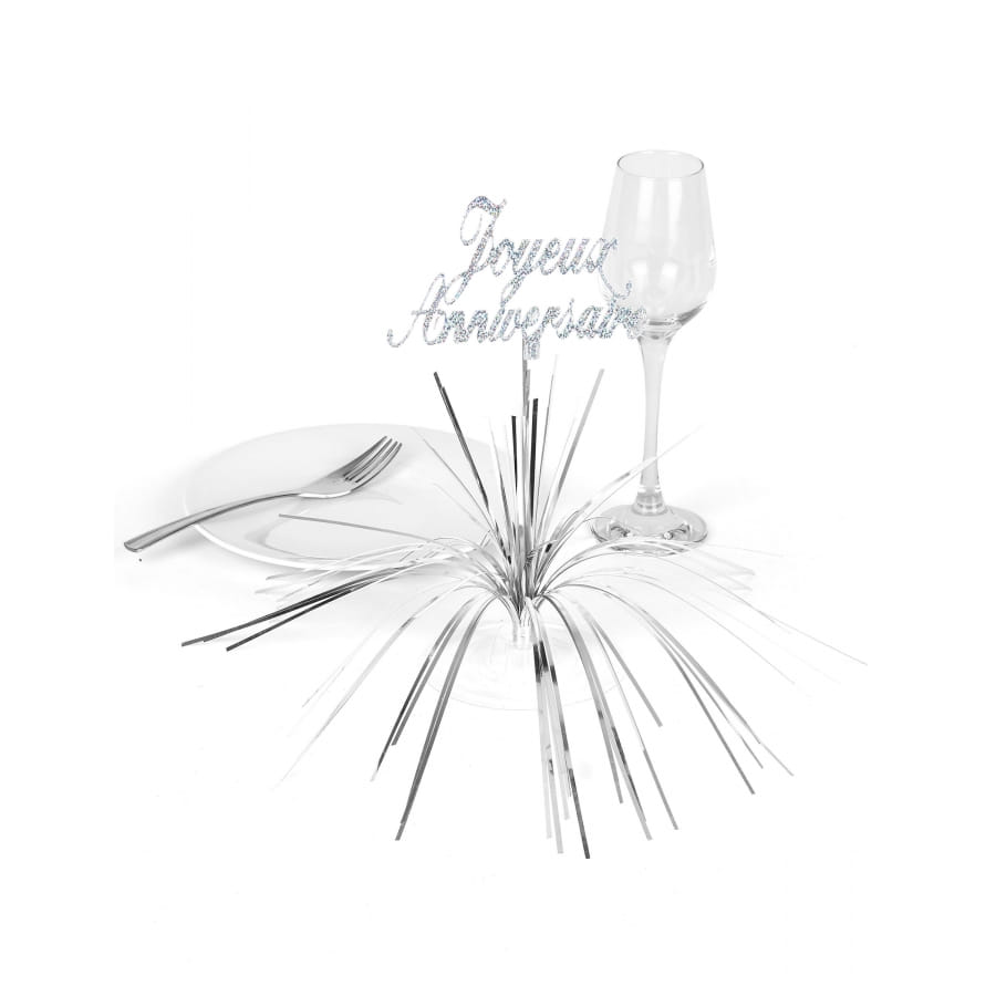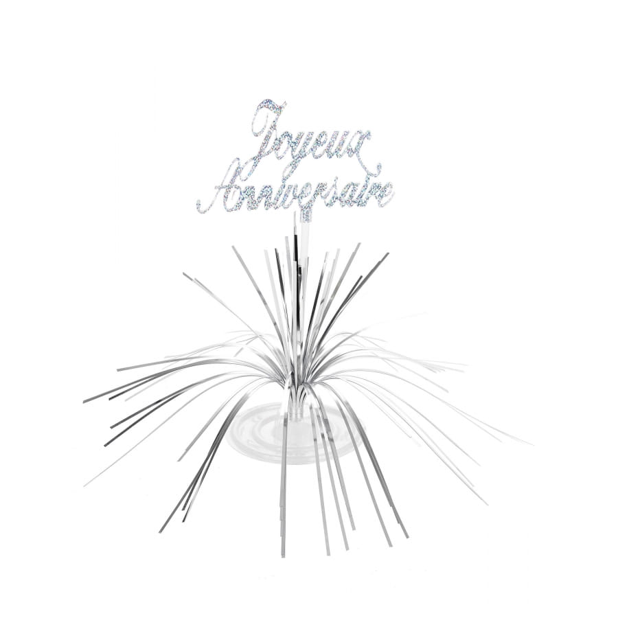 Les anniversaires se fêtent de mille et une manières. Si vous avez choisi l'option déjeuner ou dîner d'anniversaire, n'hésitez pas à mettre en place un sublime décor. Ce centre de table Joyeux Anniversaire argenté est constitué par une superbe cascade disposée sur un pied en plastique, et agrémentée de l'inscription "joyeux anniversaire" au sommet. Le tout fait une hauteur de 27 cm environ.