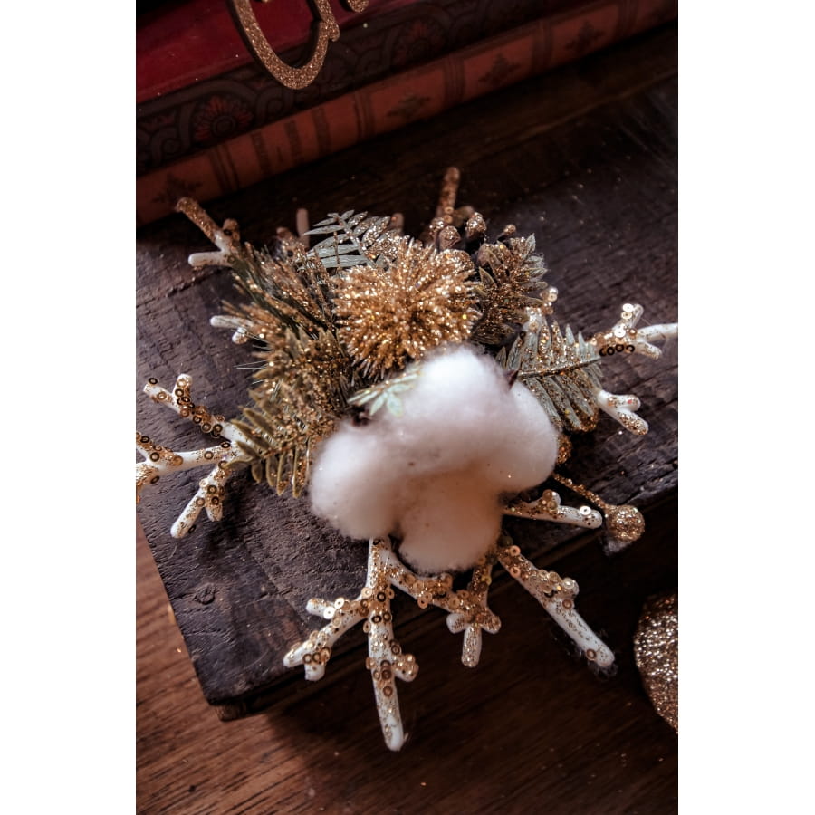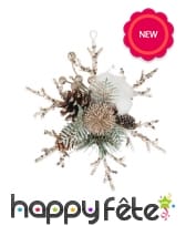 Le flocon est agrémenté de branches ou de pommes de pins recouvertes de paillettes.