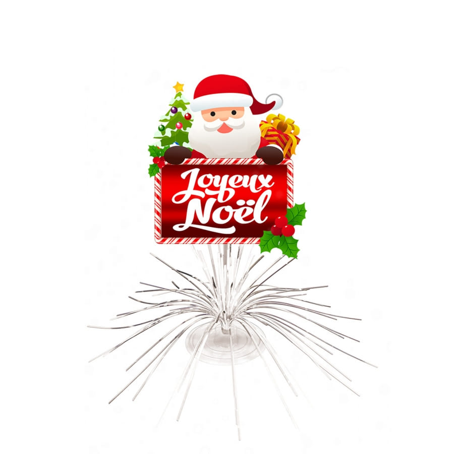 Il est constitué d'un socle transparent, d'une tige assortie recouverte de franges argentées et d'un Père Noël portant l'inscription "Joyeux Noël".
