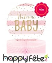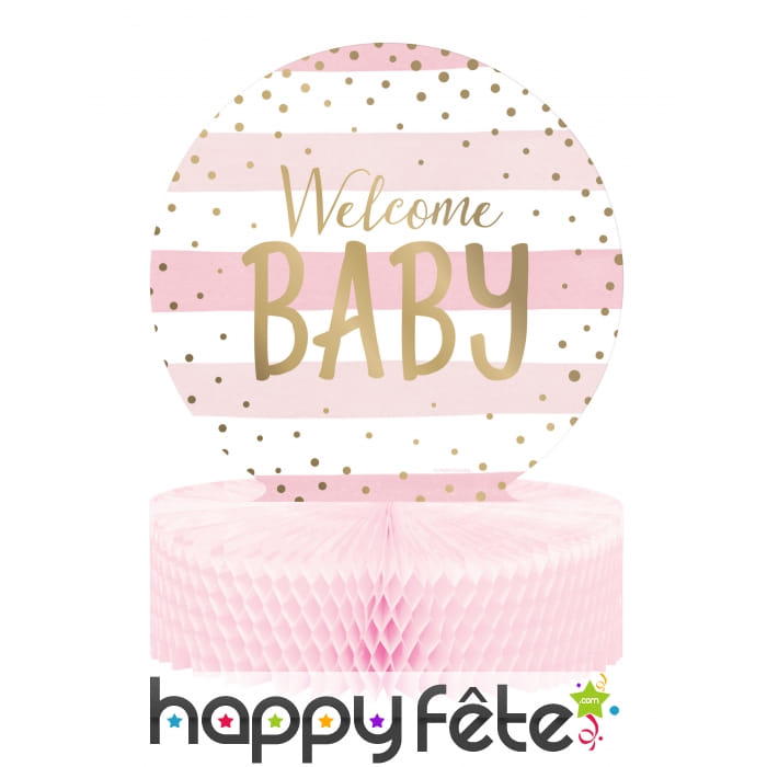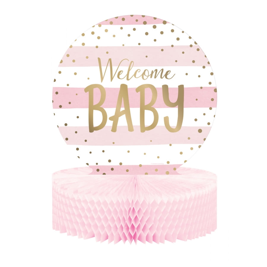 Fêtez une nouvelle naissance comme il se doit, en ajoutant au décor le centre de table Welcome Baby.