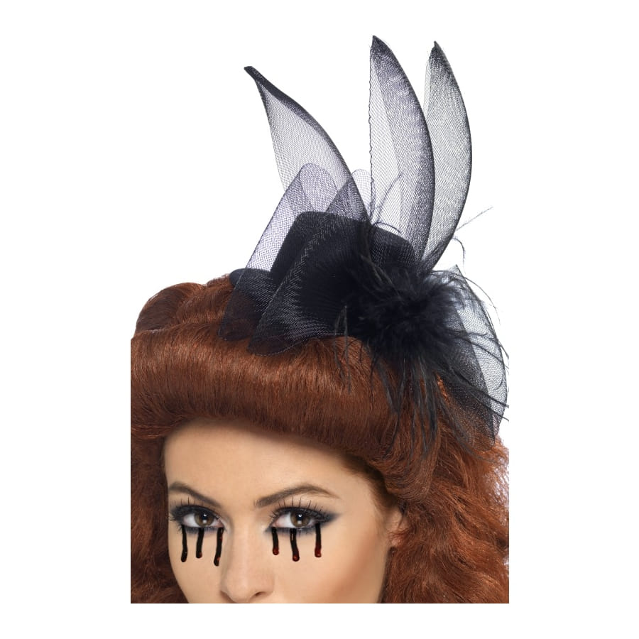 Voici un chapeau qui ne passera définitivement pas inaperçu! Entièrement noir, le chapeau est orné de voiles en horizontal et vertical ainsi que de plumes fines. Placez-le sur votre coiffure et choisissez le déguisement qui ira avec.