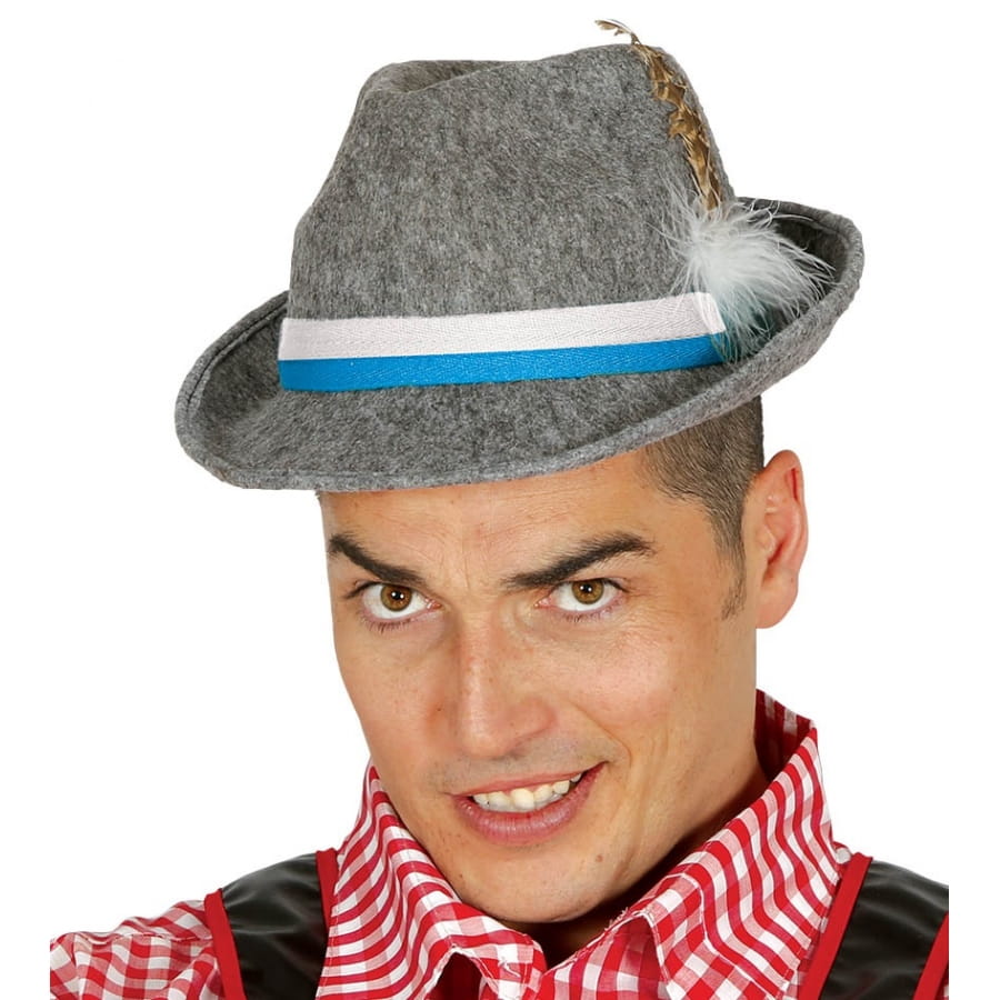 Il n'est pas toujours facile de se trouver un accessoire folklorique. Pour faire dans la simplicité, nous vous proposons ce chapeau de bavarois gris. Le couvre-chef est plutôt singulier, de couleur grise, en feutrine. Les bords ne sont pas très larges, et un ruban bicolore, en bleu et blanc, accompagné d'une petite plume, orne le chapeau.