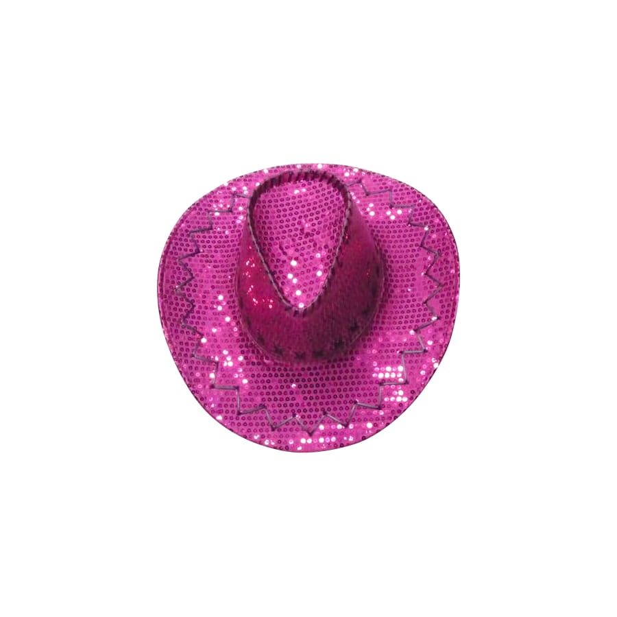 Le parfait mariage entre western et disco. Chapeau de cowboy recouvert de paillettes roses et avec coutures noires. Cet accessoire est idéal pour un carnaval Western.