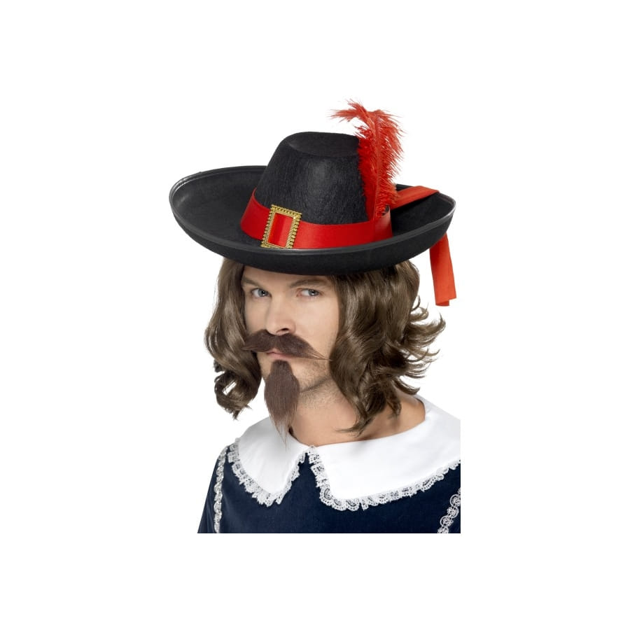 Ce chapeau de mousquetaire noir orné d'un ruban et d'une plume rouge, ainsi que d'une belle boucle dorée est fondamental pour un déguisement de mousquetaire. Les matières de fabrication de cet accessoire sont : 65% polypropylène,25% polyester, 3% plume et la taille proposée est une taille unique pour homme adulte. Pour le reste, vous n'aurez qu'à chercher un pantalon noir et une chemise blanche à froufrous avec des bottes et votre déguisement sera parfait.