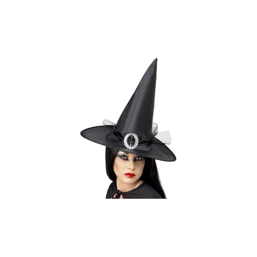 Long chapeau pointu de sorcière, pour femme ou adolescente, avec large rebord orné d'une boucle et d'un filet. Grâce à cet accessoire, vous ajouterez une touche gothique à votre déguisement de sorcière pour Halloween.