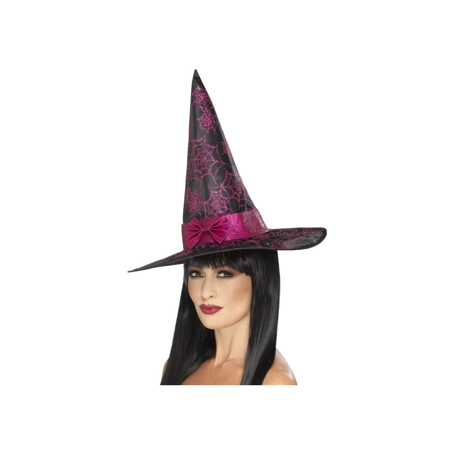 Mesdames, rajoutez de la fantaisie à votre tenue de sorcière à l'occasion de la fête des morts. Pour ce faire, nous vous proposons le chapeau de sorcière noir avec paillettes rose. Il s'agit d'un chapeau à longue calotte pointue. Conçu dans un tissu satiné, il est de couleur noire, avec des motifs de toile d'araignée rose. Ce couvre-chef se trouve couvert de paillette, avec un noeud rose à la base.