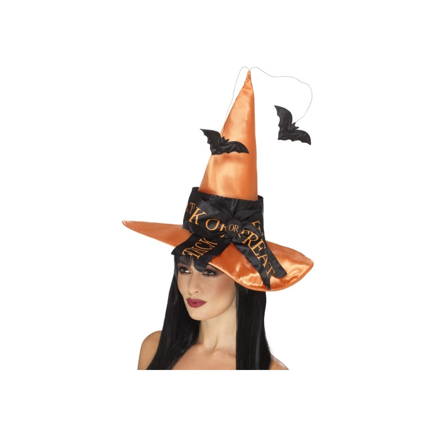 Le chapeau de sorcière orange avec chauve souris correspond à un accessoire de déguisement qui rendra votre tenue d'halloween original. Il s'agit d'un chapeau de sorcière à longue calotte pointue et de couleur orange. A son sommet se trouvent suspendues deux petites chauves-souris de couleur noire également. Le couvre-chef est décoré d'une bande de tissu noir au niveau de sa base. Celle-ci porte l'inscription « Trick or Treat Witch Hat ».