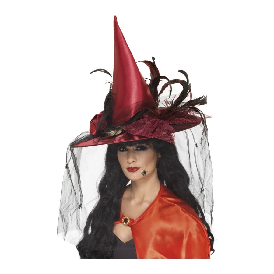 Long chapeau de sorcière pointu, pour femme ou adolescente. Le chapeau est de couleur rouge, avec noeuds et fleurs assortis, plumes noires et voile en résille. Ce chapeau luxueux apportera une touche glamour à votre déguisement de sorcière pour Halloween.