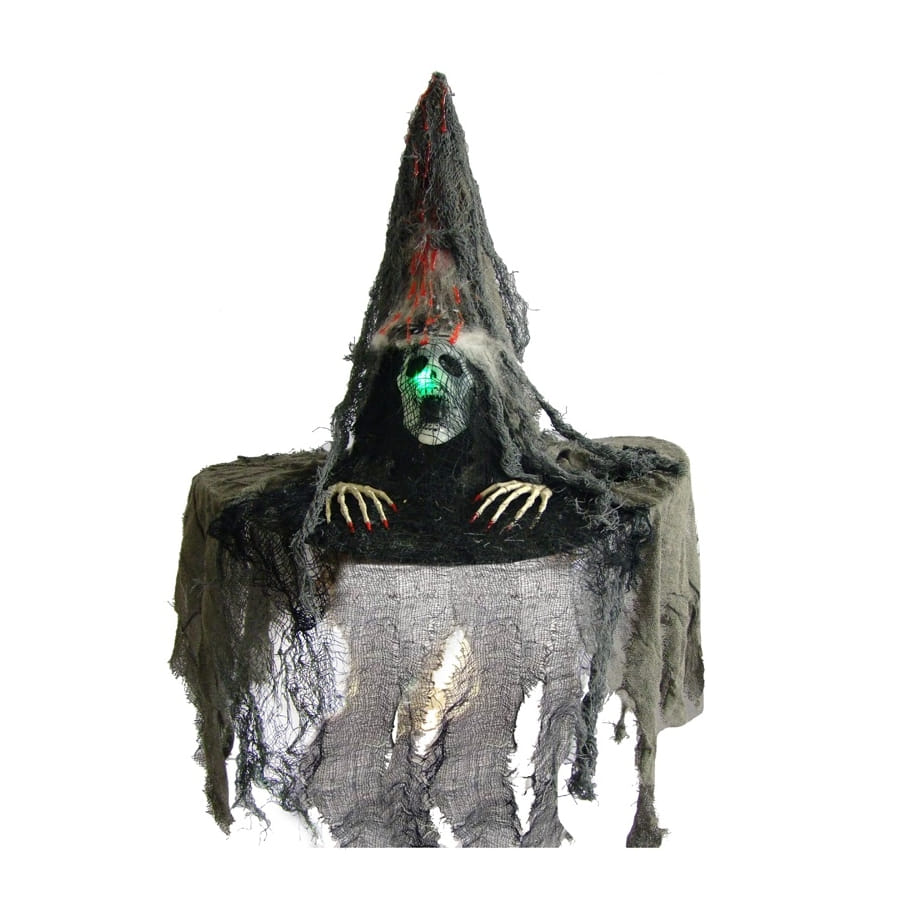 Un chapeau très effrayant pour un déguisement réussi ! Ce redoutable chapeau de sorcière tête de mort lumineuse est de taille adulte. Il est de couleur noire, recouvert d'un tissu gris à effet déchiré et sale, ressemblant à une épaisse toile d'araignée. Une tête de mort ainsi que des squelettes de mains sont présents sur le devant. De fausses gouttes de sang venant du haut du chapeau semblent circuler vers le bas pour donner un effet encore plus horrifiant. Et ce n'est pas tout, ce chapeau monstrueux émet de la lumière, ce qui va susciter un effet très spectaculaire!