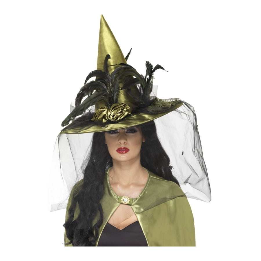 Long chapeau de sorcière pointu, pour femme ou adolescente. Ce chapeau de couleur verte est ornée d'une multitude de plumes noirs, de fleurs et d'un voile en résille noir. Vous pourrez à la fois avoir l'air maléfique et glamour à la fois!