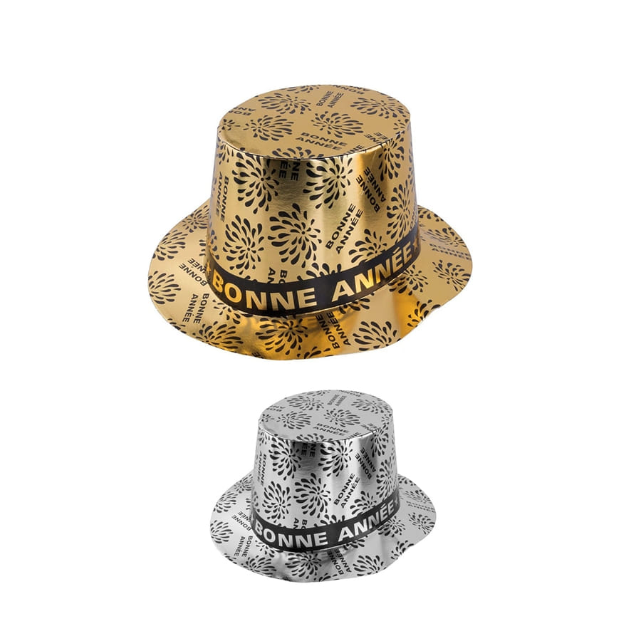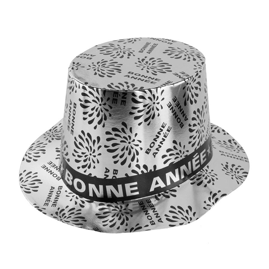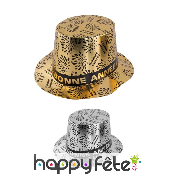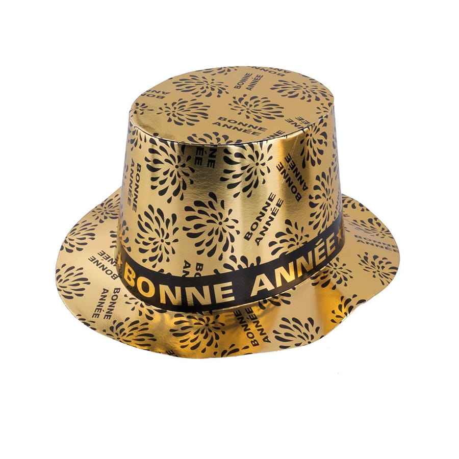 Le chapeau est un haut de forme de toute beauté présentant à la base de la calotte les mots "BONNE ANNÉE" sur fond noir.