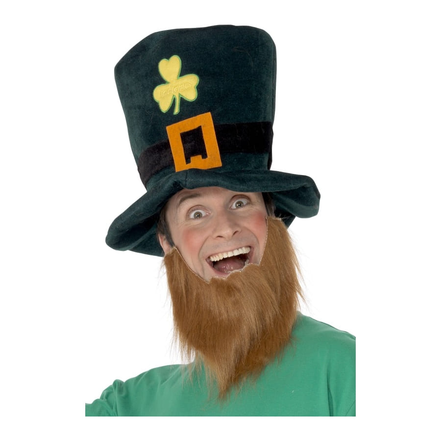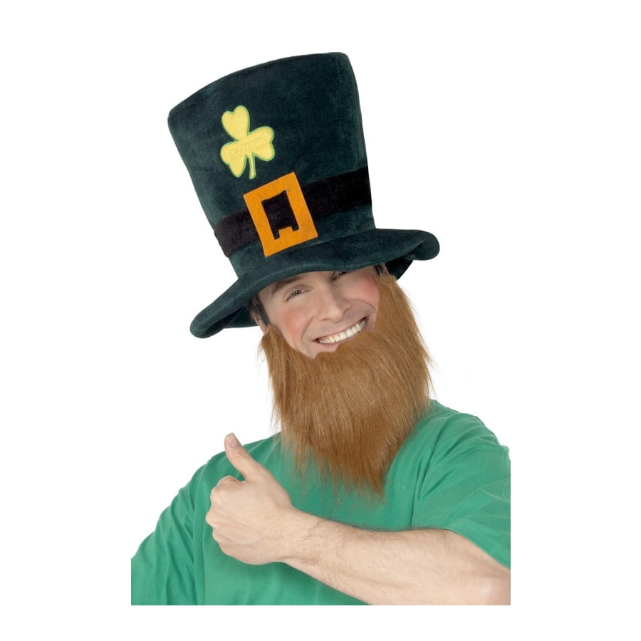 Chapeau et barbe de Leprechaun pour homme ou adolescent. Le chapeau est grand de couleur verte avec un trèfle jaune et une bande noire avec boucle, tandis que la barbe est rousse. Ce déguisement convient très bien à une occasion telle que la Saint Patrick.