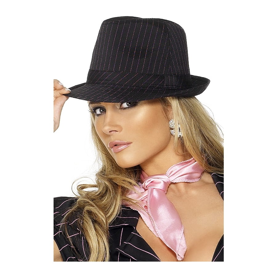 Chapeau de gangster de couleur noire pour femme. Ce chapeau est orné de rayures roses très fines et d'un ruban assorti, qui vous donneront un look très élégant et discret à la fois. C'est un accessoire indispensable pour un déguisement de gangster réussi.