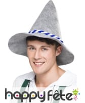 Ce chapeau présente une forme conique, avec l'extrémité agrémentée d'une décoration jaune.