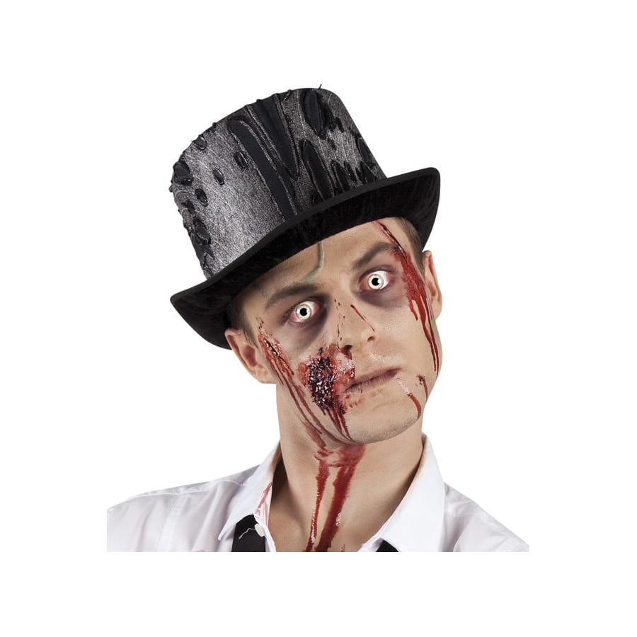 Pour vous qui aviez choisi de porter un costume de zombie pour la fête d'Halloween, nous vous présentons le chapeau haut de forme noir effet usé et troué pour compléter votre déguisement.