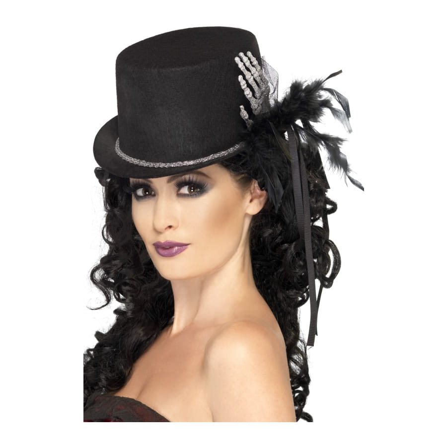 Haut chapeau de couleur noire avec bande paillettée et main de squelette assortie, pour homme, femme, adolescent ou adolescente. Ce déguisement complètera à merveille un déguisement d'Halloween.