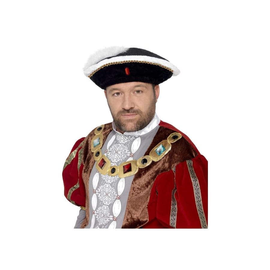 Votre déguisement d'Henri VIII sera parfait avec ce chapeau de Henry VIII que ce cher roi avait l'habitude de porter. Avec un style royal, ce chapeau est de couleur noire et est orné d'une plume blanche. Sa composition est de 99% en polyester et de 1% en plume. La taille proposée est une taille unique pour homme.