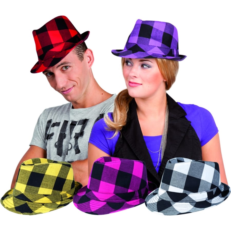 Chapeau Justin Bling Bling à carreaux. Il est impossible de choisir le modèle ou la couleur du chapeau. Vous recevrez une des couleurs présentées: blanc, jaune, rose ou rouge. Ce chapeau est idéal pour un soirée années 70-80.