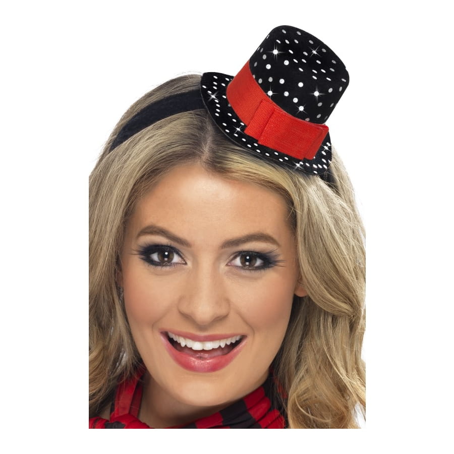 Sere-tête pour femme monté d'un petit chapeau de Madame Neige. Ce dernier est en similaire à un haut-de-forme, entièrement noir, recouvert de séquins blancs et orné d'un magnifique ruban rouge. Placez-le sur vos cheveux pour égayer votre tenue!