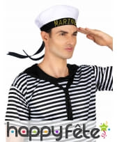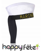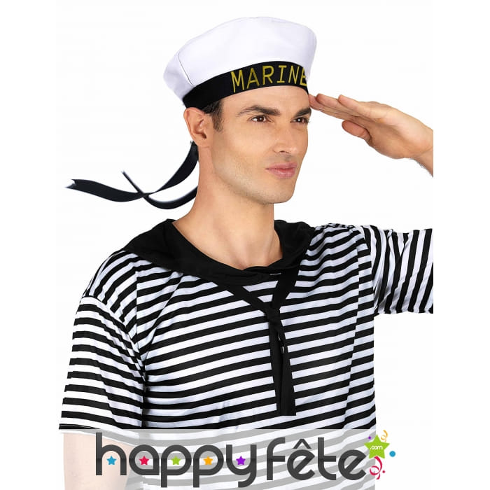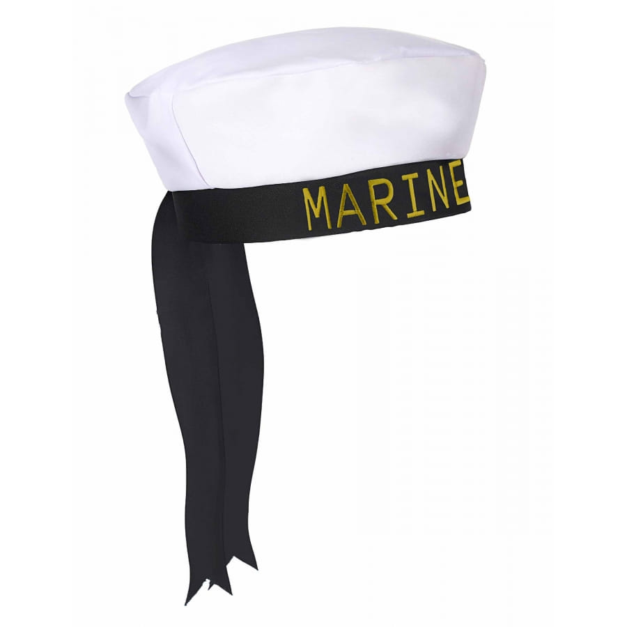 Chapeau de marine pour homme ou adolescent. Le chapeau est de couleur blanche avec rebord noir imprimé du mot "Marine" en jaune. Ce chapeau vous donnera un air de vaillant Marine pour un enterrement de vie de garçon ou de jeune fille.