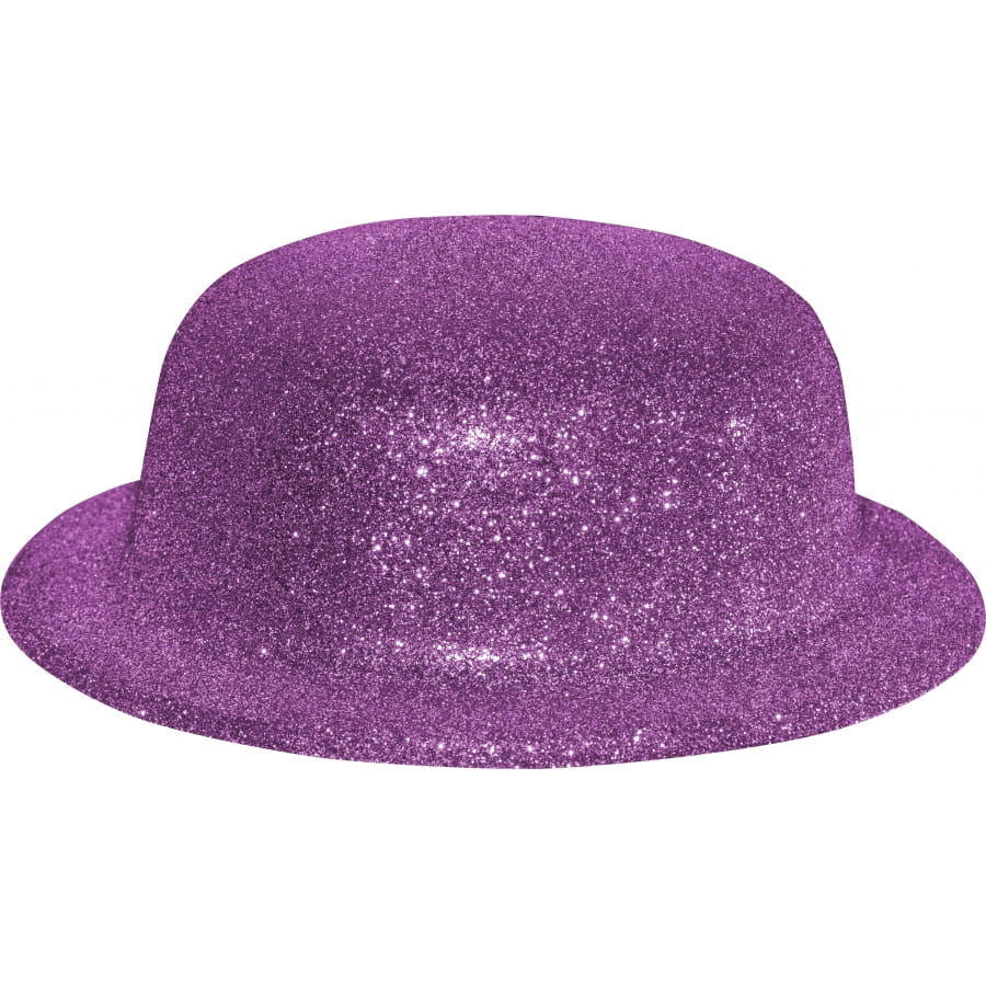 Chapeau melon de couleur violette entièrement recouvert de paillettes, pour femme. Cet accessoire est indispensable lors de fêtes!