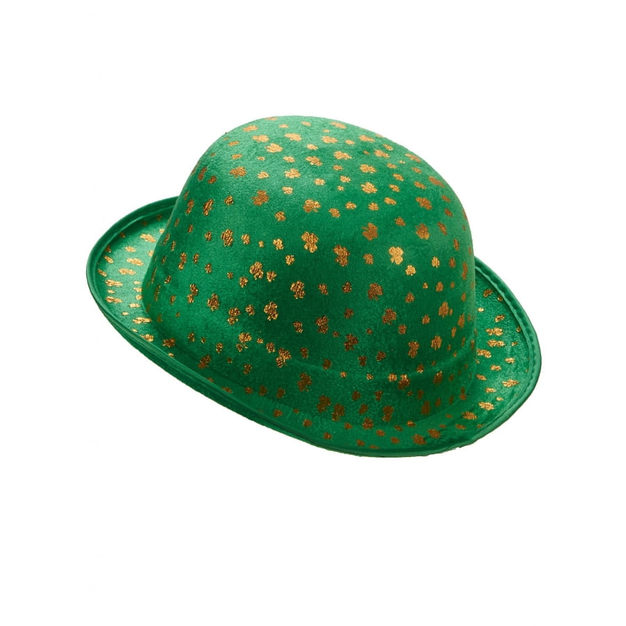 Le chapeau melon vert floqué de trèfles dorés pour adulte possède une structure rigide.