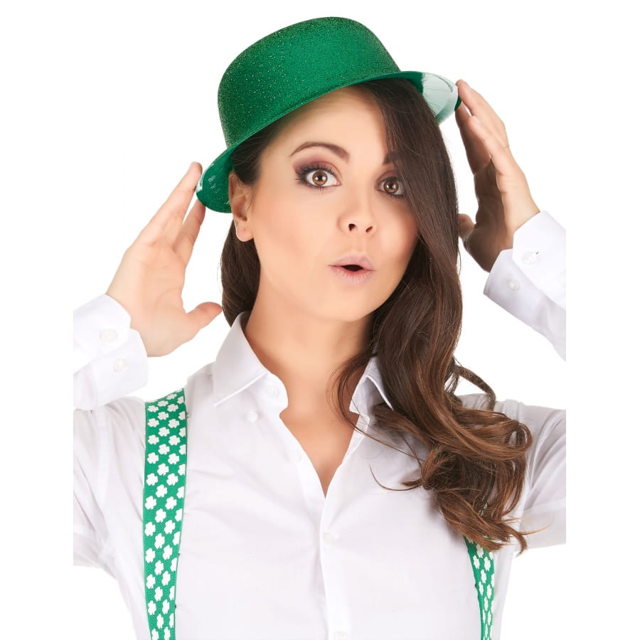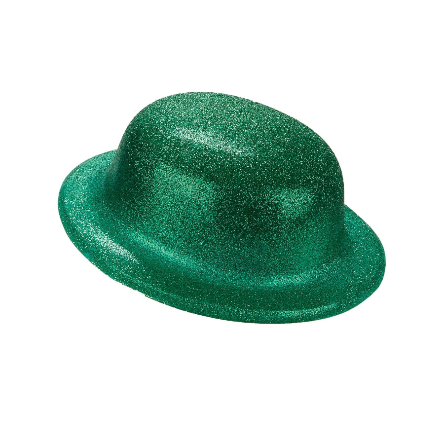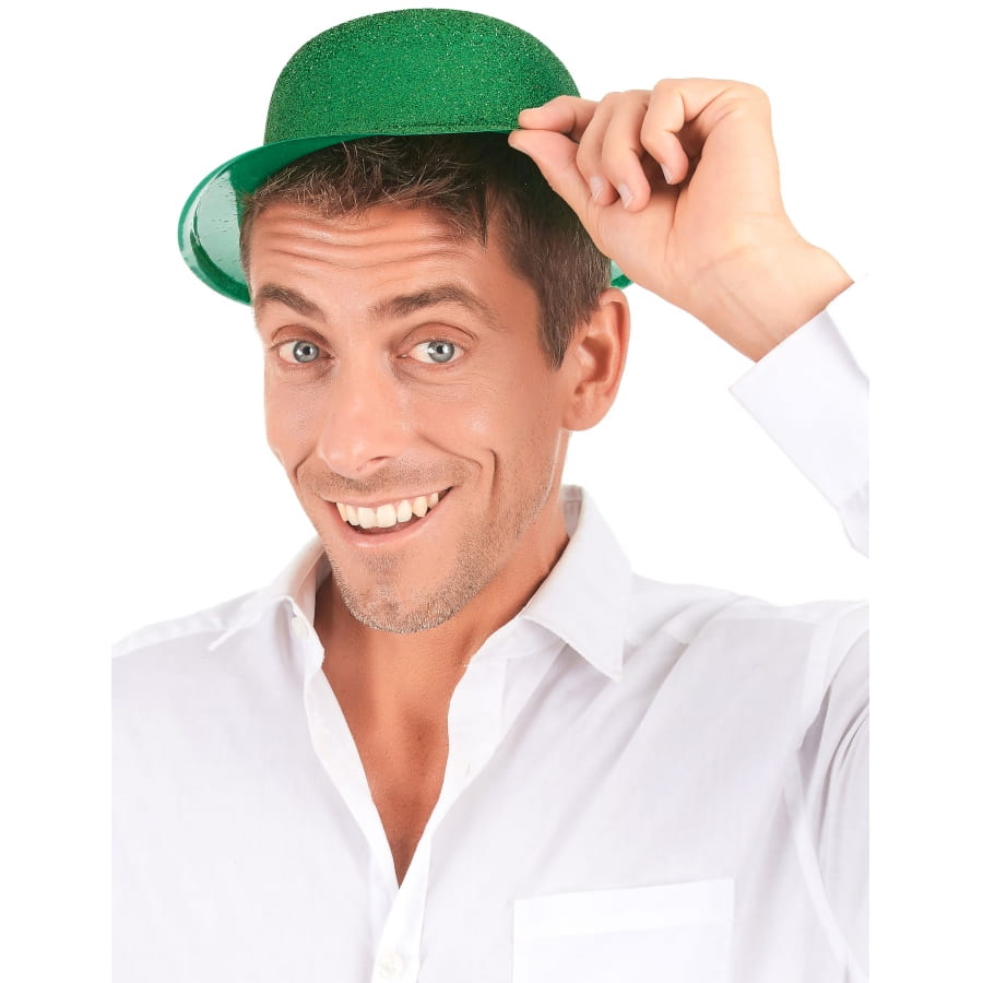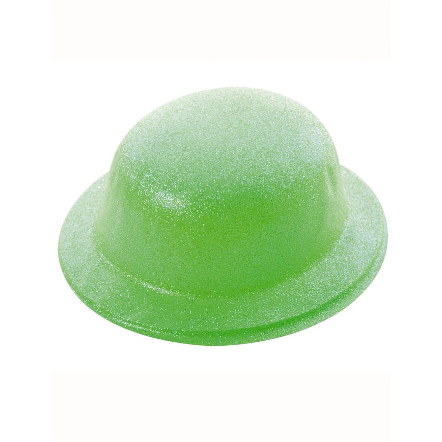 Le chapeau melon vert uni pailleté est en plastique fin.