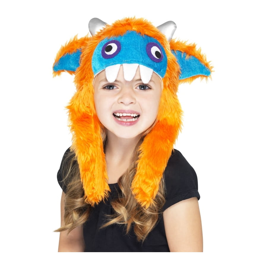 Chapeau de monstre en fourrure de couleur orange, avec oreilles bleues et cornes et dents blanches. Le chapeau arrive jusqu'aux épaules et donneront à votre enfant un air drôle et mignon à la fois.