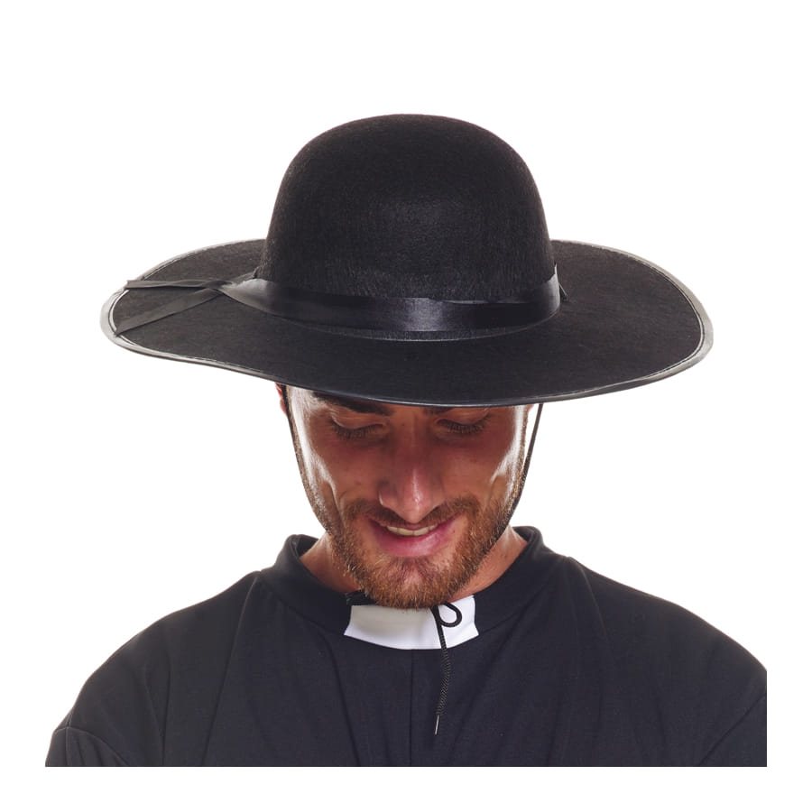 Du jamais vu, un curé anime une soirée avec des blagues hilarantes ! Incarnez le rôle d'un religieux un peu déséquilibré lors d'un enterrement de vie de célibataire grâce à ce chapeau noir de curé pour adulte. Il s'agit d'un chapeau à ficelle, de couleur noire et orné d'un ruban noir. L'accessoire fignolera à merveille votre déguisement de religieux.