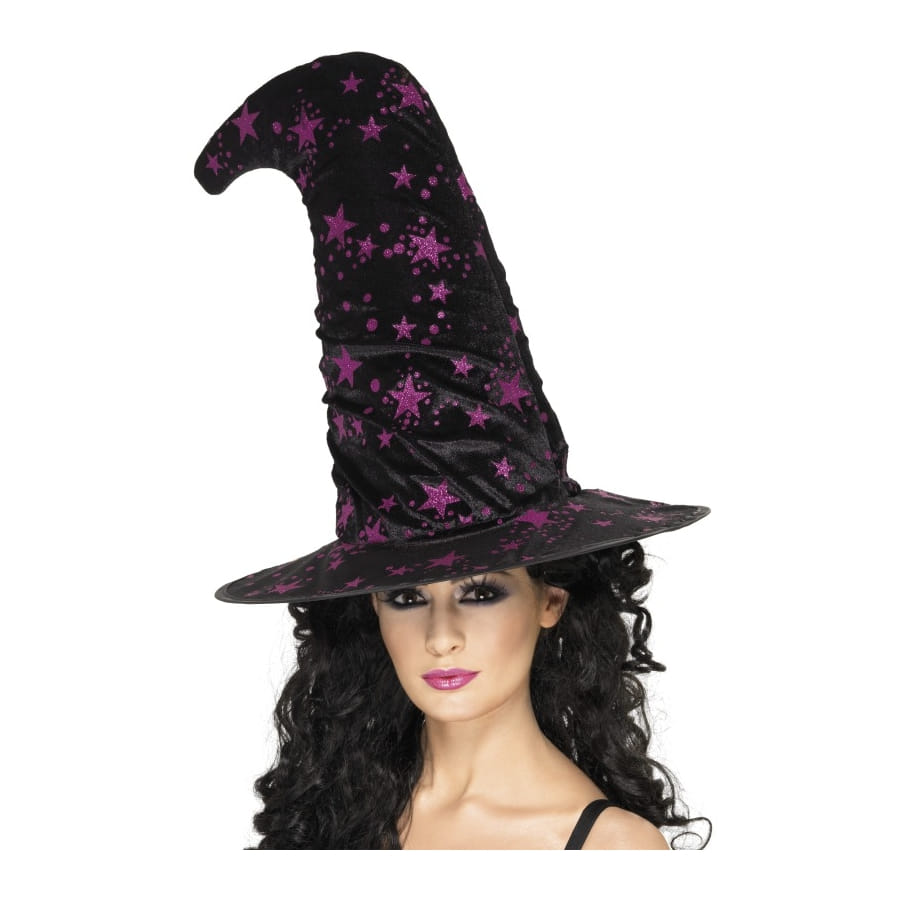 Chapeau de sorcière de couleur noire pour femme. Le chapeau est long et large, avec un haut courbé et imprimé d'une multitude d'étoiles violettes. Il sera idéal pour Halloween, ajoutant une touche glamour à votre déguisement de sorcière grâce aux étoiles.
