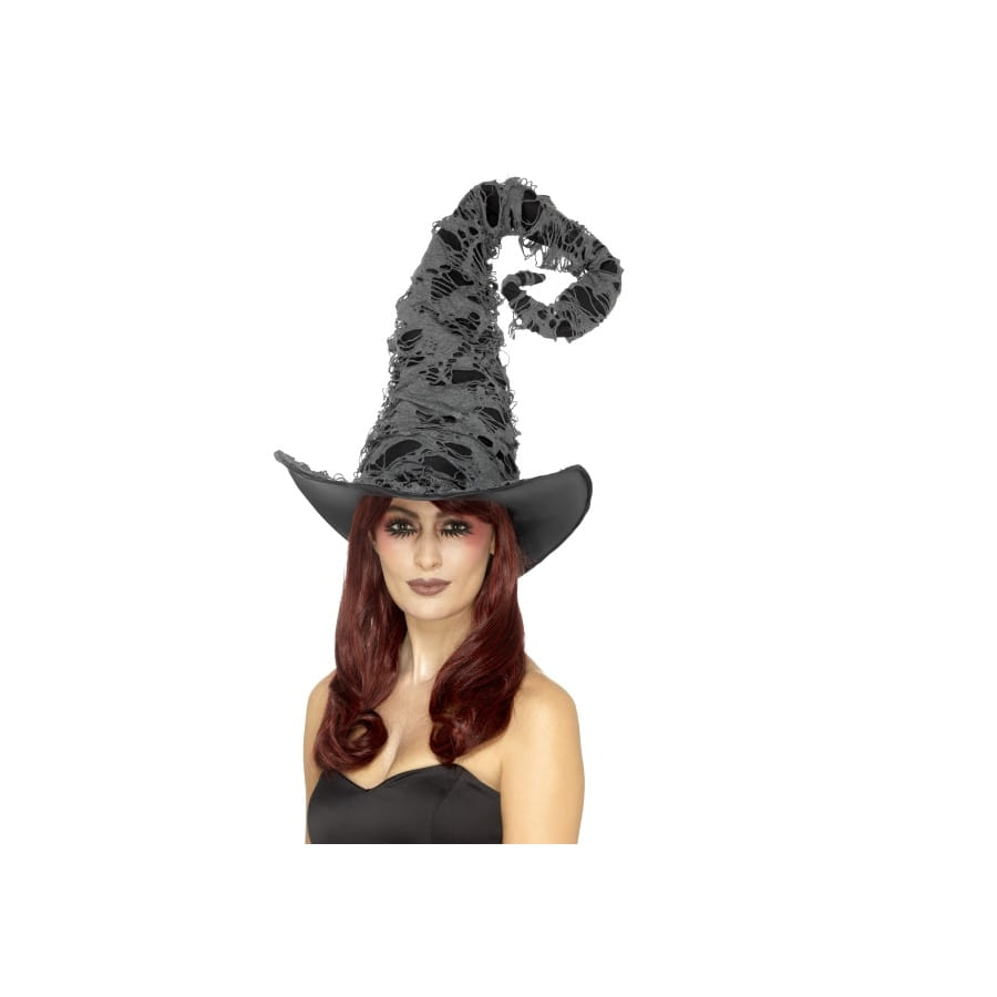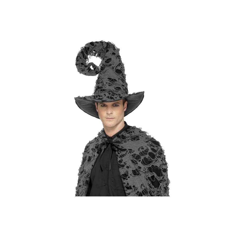 Si vous recherchez un chapeau pour compléter votre tenue de sorcier à l'occasion de la fête des morts, nous avons ce qu'il vous faut. Nous vous proposons le chapeau pointu de sorcier luxe qui reste disponible sur notre site. Ce couvre-chef a une longue calotte pointue recourbée sur elle-même. Elle est de couleur noire et se trouve recouverte d'un tissu gris troué. Ce détail lui donne un caractère original en adéquation avec halloween.
