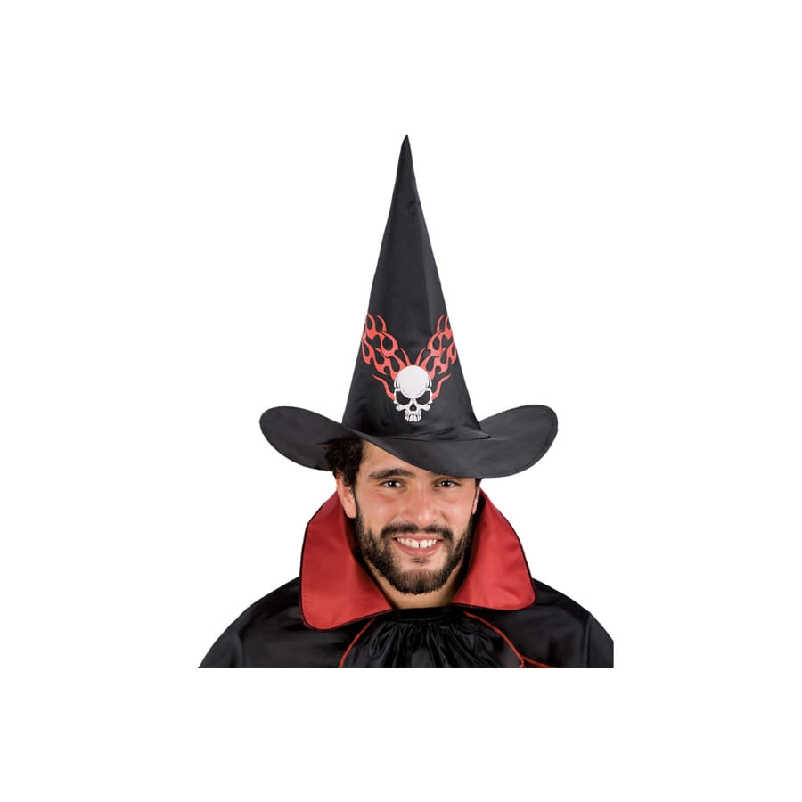 Messieurs, vous aurez besoin de ce formidable chapeau magique avant de débarquer à une soirée d'Halloween. Il vous métamorphosera en puissant sorcier des temps modernes ! Il s'agit d'un magnifique chapeau pointu de couleur noire. Mais ce qui le rend spécial, c'est l'image horrifiante d'une tête de mort au centre. Cet accessoire est la touche finale indispensable à un déguisement de sorcier.